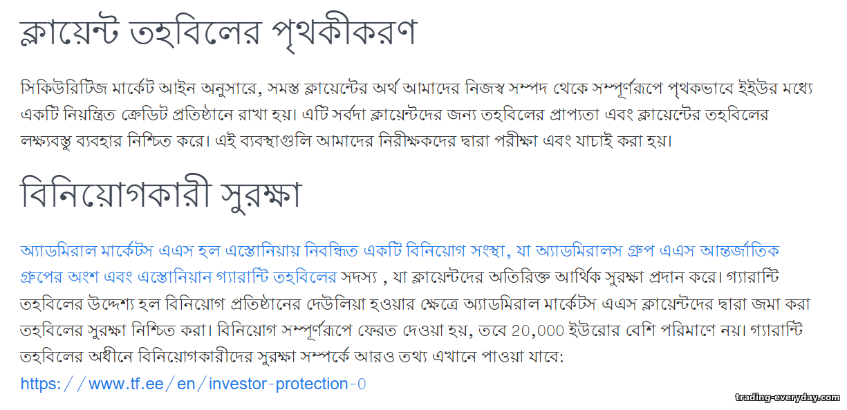 - ক্লায়েন্ট ফান্ড সুরক্ষা। নিয়ম মেনে Admirals ক্লায়েন্ট অর্থ কোম্পানি তহবিল থেকে আলাদা (ইউরোপীয় ব্যাংকে) রাখে। EU/UK রিটেইল ক্লায়েন্টদের নেগেটিভ ব্যালান্স প্রোটেকশন রয়েছে — তীব্র বাজারেও ডিপোজিটের চেয়ে বেশি ঋণী হবেন না। ক্ষতিপূরণ স্কিম প্রযোজ্য: UK-এ Admirals UK ক্লায়েন্টদের জন্য FSCS £85,000 পর্যন্ত, EU-এ Admirals Cyprus-এ Investor Compensation Fund €20,000 পর্যন্ত।