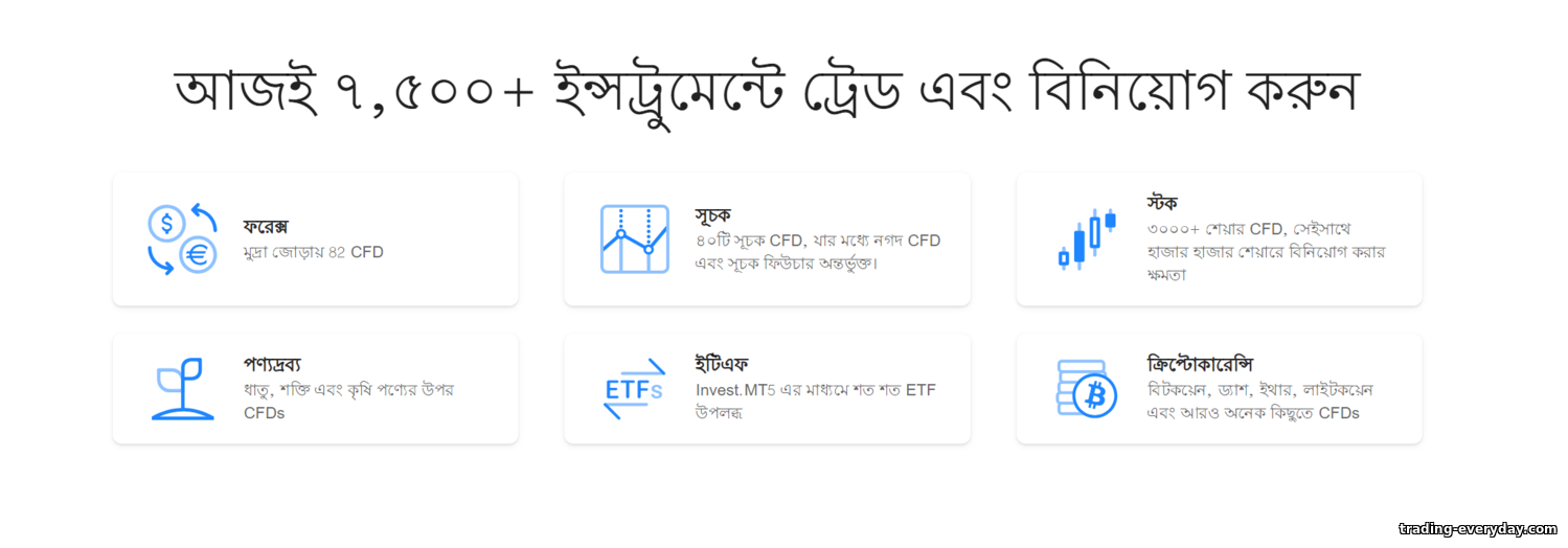 - উপলভ্য ইন্সট্রুমেন্ট: 8,000+ — FX পেয়ার; শেয়ার, সূচক, কমোডিটি, বন্ড, ক্রিপ্টোকারেন্সি, ETF-এর CFDs ইত্যাদি