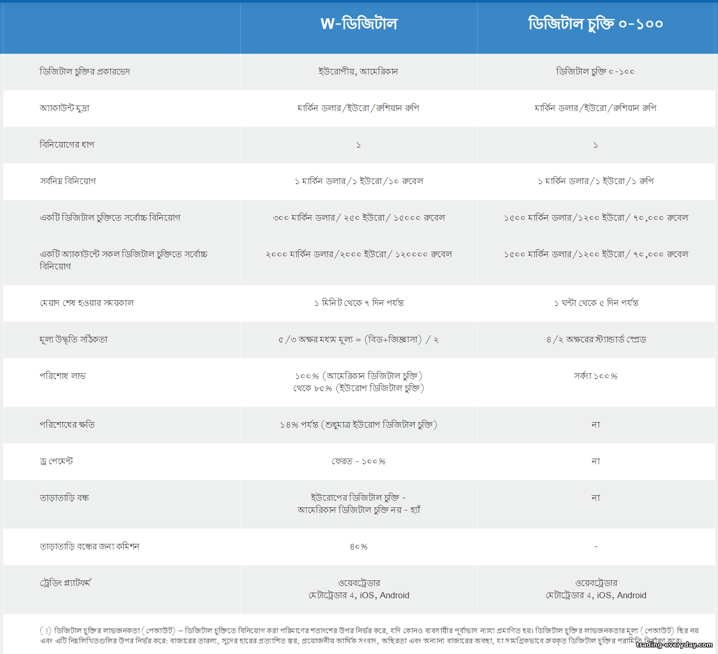 | W-DIGITAL | ফিক্সড, ~1.8 পিপস (আন্ডারলাইং বাজার) | 40% (আগাম এক্সিটে) | বাইনারি অপশন অ্যাকাউন্ট। স্টেক $1 থেকে, রিটার্ন স্টেকের সর্বোচ্চ 100%। ফি কেবল আগাম বাই‑আউটে (~40% ফেরত)। |