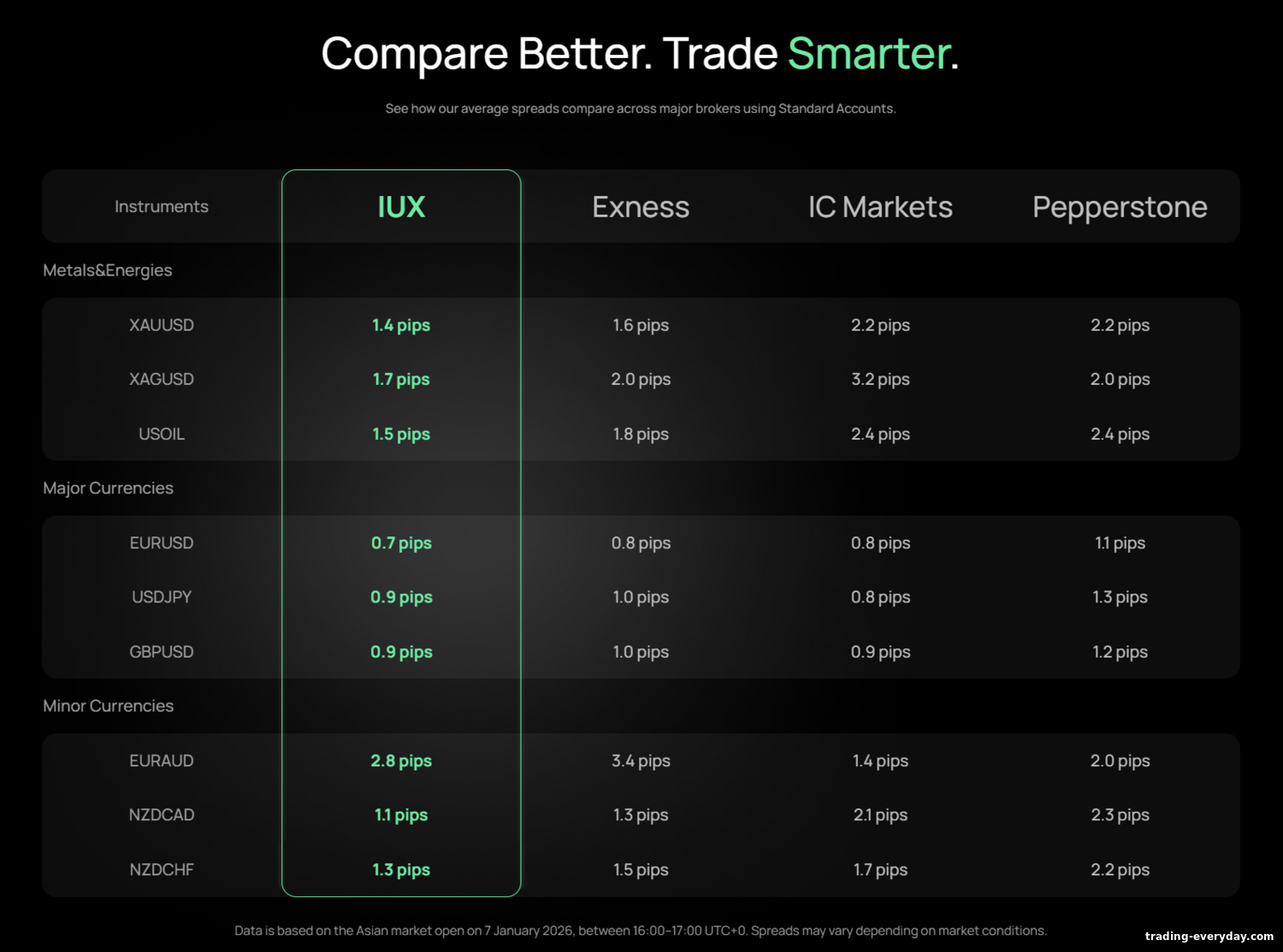 প্রতিযোগীদের প্রেক্ষিতে, IUX-কে প্রযুক্তিনির্ভর অনলাইন ব্রোকার হিসেবে স্থাপন করা হয় যেখানে ক্লায়েন্ট-সাইড খরচ কম। উদাহরণস্বরূপ, EUR/USD-এর গড় স্প্রেড প্রায় 0.6 পয়েন্ট, যা বাজারের গড় 1.0–1.2 পয়েন্টের চেয়ে কম। অনেক বড় ব্রোকারের (FXPro, AMarkets) মতো নয়—Standard অ্যাকাউন্টে IUX ট্রেডিং কমিশন নেয় না, আর এর লিভারেজ (1:3000 পর্যন্ত) নিয়ন্ত্রিত ইউরোপীয় ফার্মগুলোর সাধারণ সীমা (সাধারণত 1:30–1:50) থেকে অনেক বেশি। এক্সিকিউশন কোয়ালিটি ও স্প্রেড লেভেলে, IUX IC Markets এবং Exness-এর মতো পরিচিত নামের সঙ্গে প্রতিযোগিতা করতে চায়, পাশাপাশি কিছু নিজস্ব ফিচারও দেয়: TradingView ইন্টিগ্রেশনসহ ওয়েব টার্মিনাল, LotBack রিবেট প্রোগ্রাম এবং 24/7 কাস্টমার সাপোর্ট।